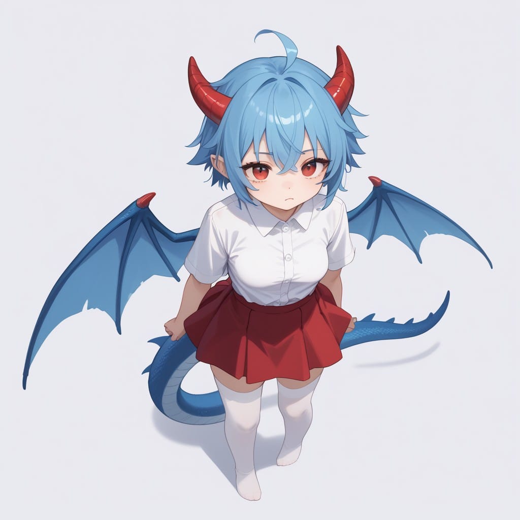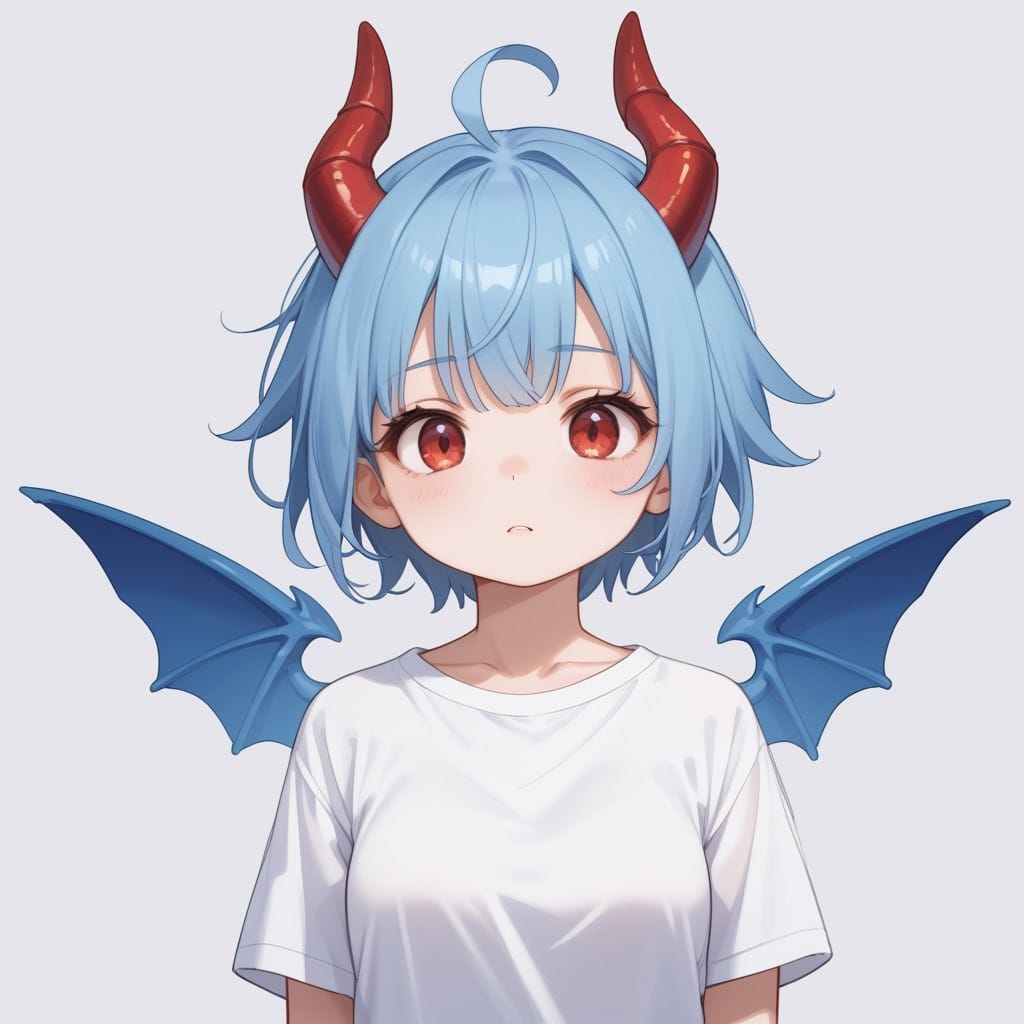 Это синеволосая девочка-дракон с красными рожками, синими крыльями и в красной юбке. Она часто используется для оформления обложек и в качестве примера того, как нейросети генерируют изображения.